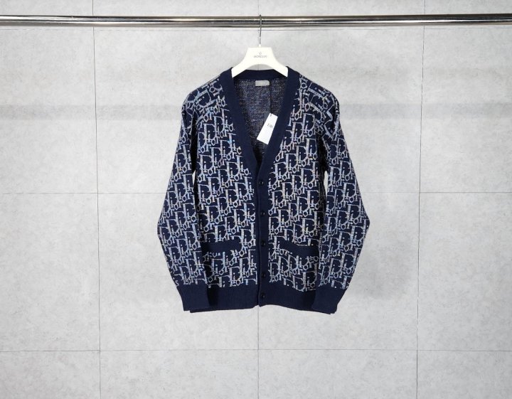 올오버 멀티 컬러 Dior Oblique 자카드 Dior 인그레이빙 혼 버튼 래글런 슬리브 옆면 웰트 포켓 리브드 커프스와 밑단 *두툼하게 짠 헤비게이지 니트 가디건 입니다.