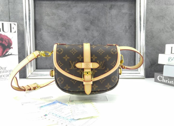 · 모노그램 코팅 캔버스 · 천연 카우하이드 트리밍 · 마이크로화이버 안감 · 골드 색상 하드웨어 · 자석형 잠금장치가 있는 천연 카우하이드 가죽 소재의 버클 · 옆면 버클 2개 · 뒷면 플랫 포켓 · 스트랩:탈부착 가능, 길이 조절 가능