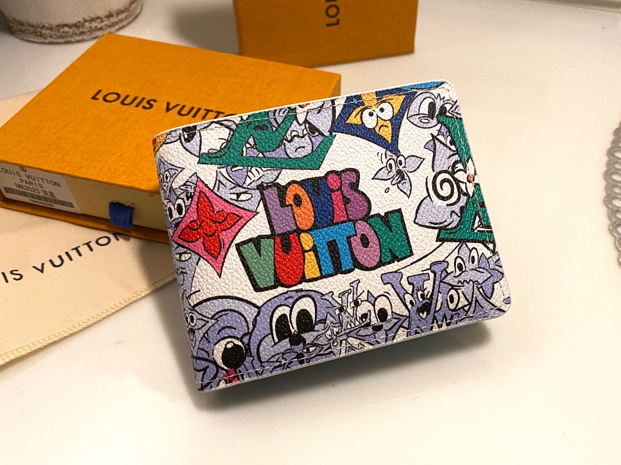모노그램 코믹스 코팅 캔버스 카우하이드 가죽 소재의 트리밍 카우하이드 가죽 소재의 안감 카드 슬롯 3개 내부 포켓 2개 지폐 및 티켓용 수납공간 2개 옆면 영수증 슬롯 2개