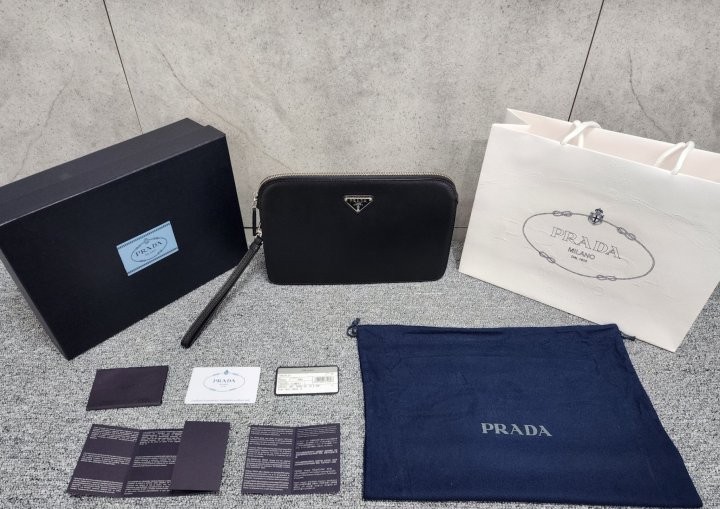 프라다 사피아노 가죽 파우치 클러치백 입고 되었습니다 금속부터 삼각로고 사피아노가죽, 레이저 레터링, 각인, 포장까지 정품급 입니다. 선물용으로 너무 좋은제품 입니다. 사진동일 케이스, 더스트, 쇼핑백, 풀구성 출고 입니다.