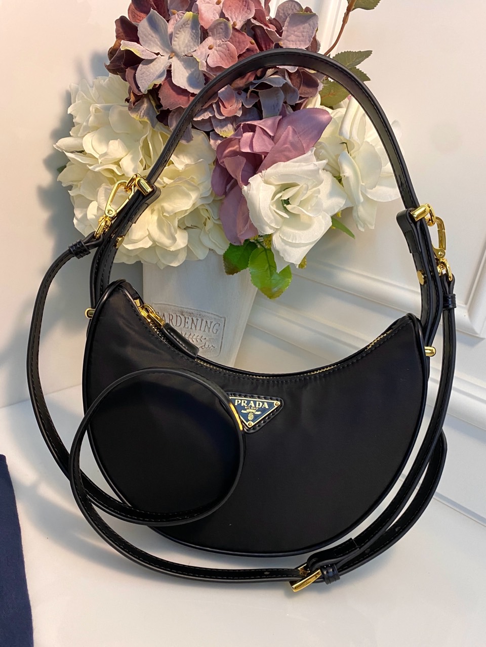 탈부착이 가능한 맞춤 조절형 가죽 핸들 탈부착이 가능한 맞춤 조절형 가죽 숄더 스트랩 메탈 하드웨어 전면 에나멜 메탈 트라이앵글 로고 지퍼 클로저 패치 포켓이 있는 나파 가죽 내부