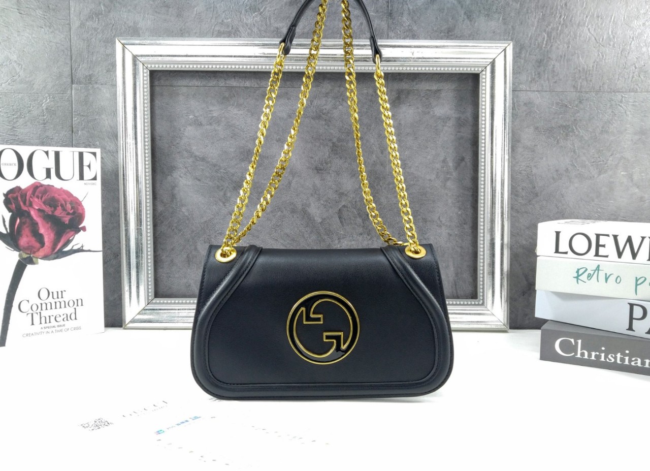 블랙 레더 트리밍 브라운 코튼 리넨 안감 에나멜 라운드 인터로킹 G 내부: 지퍼 포켓 1개 외부: 뒷면 오픈 포켓 슬라이딩 체인 스트랩은 48cm 드롭 숄더 스트랩 혹은 29cm 드롭 탑 핸들 형태로 착용 가능함. 마그네틱 클로저