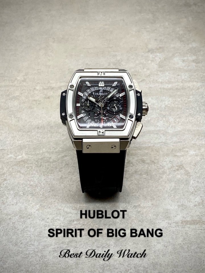 위블로의 상징적인 모델 빅뱅의 정체성과 영혼을 사각형케이스에 담은 제품으로 빅뱅의 전통적인 H모양의 나사들이 베젤을 견고하게 잡아주고 러그와 어태치먼트 부분들역시 전형적인 빅뱅 디자인 제품입니다